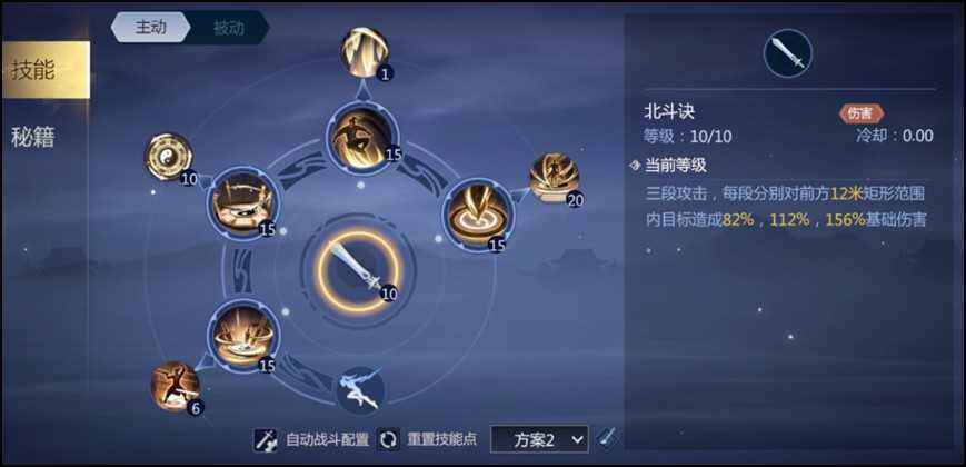 普攻北斗诀:3次范围形递增伤害,在技能调息时间较长的情况下,我们可以在技能中穿插普攻来进行输出 1技能——天璇剑气天璇剑气•坎:群伤控制技能,定身12米范围内目标,造成范围伤害