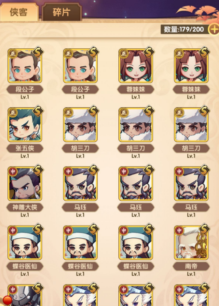 2.碎片(获取途径比较多,过图,刷塔,活动,侠客拜访等,通用碎片是随机并且只能出普通阵营角色,指定侠客碎片主要通过阵营寻侠和侠客拜访获得)