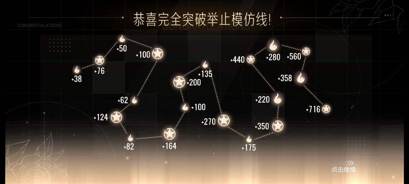 先来看突破,获得卡牌会自动开启举止模仿的突破,然后需要继续提升卡牌等级才能开启心态领悟的突破;每次突破会获得不定的属性加成,举止模仿是演技&灵感的加成,心态领悟是魅力&学识的加成。