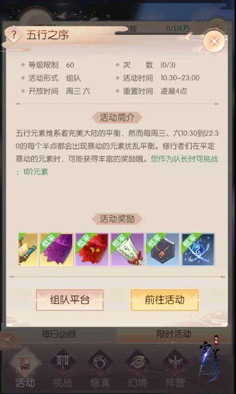 参与五行之序将有概率产出1级、2级、3级天书奖励,修真者们需自行组队前往。