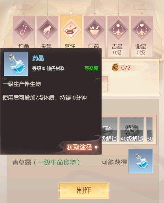 除此之外,烹饪和只要还能有几率生产伴生品,这些伴生品可以为修真者增加状态BUFF。当然,制药和烹饪的制作前提是需要采集技能,所以基础材料获取类的技能也是必须升级的,这些采集技能也能随机产生伴生品。