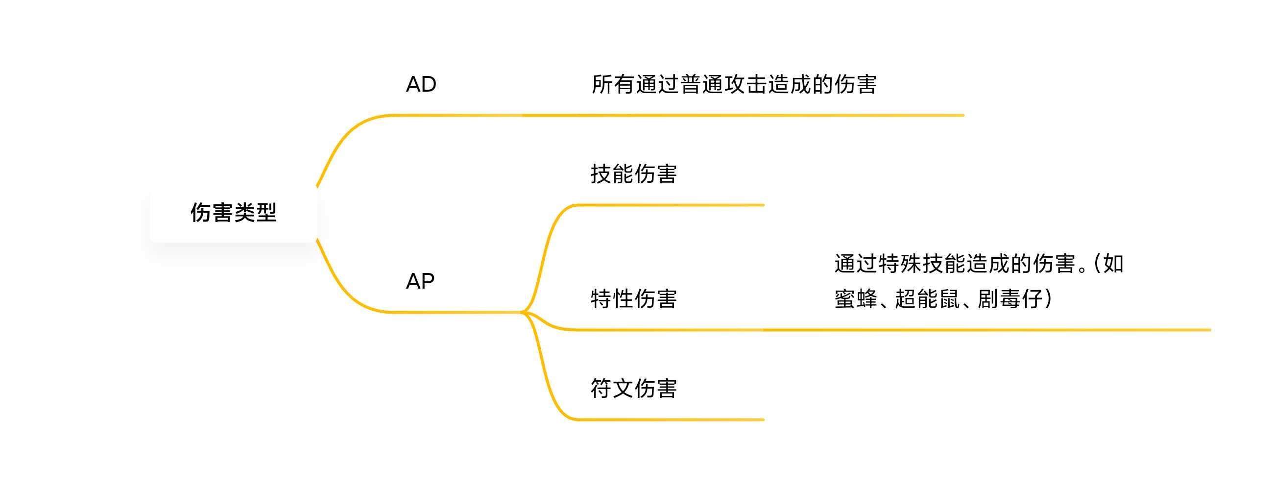 我大胆引入了AD、AP伤害的概念,来方便各位理解。因为技能、符文、特性,这三种类型其实是一种伤害的三种不同表现形式,背后计算伤害的逻辑和公式是一样的。所以我用AP伤害将他们囊括在了一起,也方便后文叙述。其中AP伤害又有细分: