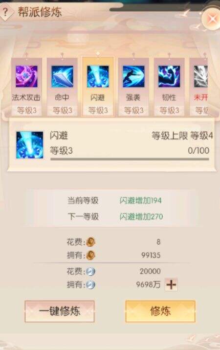 帮派修炼属性的上限与帮派建筑修炼房的等级有关。升级修炼属性不能超过等级上限。