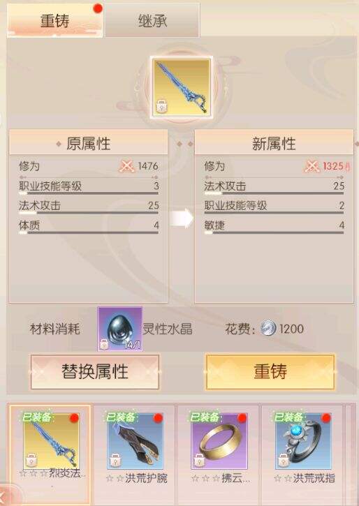 和精炼一样,重铸也有继承系统。玩家可以通过重铸继承将来源装备中的附加属性继承至目标装备中,来源装备的附加属性将消失。重铸继承将根据装备等级和品质消耗不同数量的继承石,重铸的属性只可以向品质更高,等级更高的装备上继承。