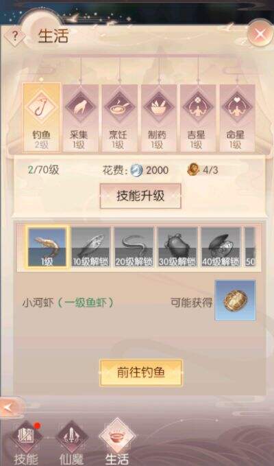 游戏中存在着很多生活技能,这些技能需要通过消耗帮贡和银币进行学习,这里建议修真者们先挑选钓鱼或者采集这样的基础技能。因为生活技能产出的物品是所有玩家在日常活动中需要用到的,属于刚需产品。以钓鱼和采集为例,在开服的前10天,钓鱼和采集等级在30级以上的话,100点精力可以获得的产品大概能卖到5万金币左右,这已经是非常高的收益了。
