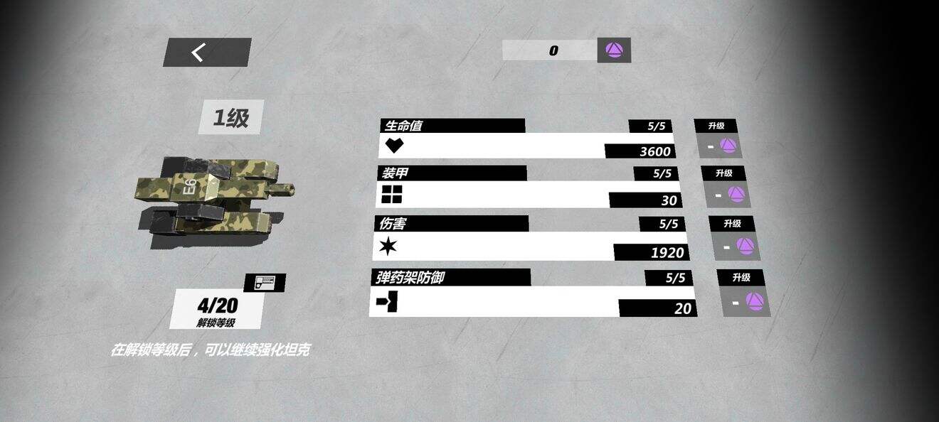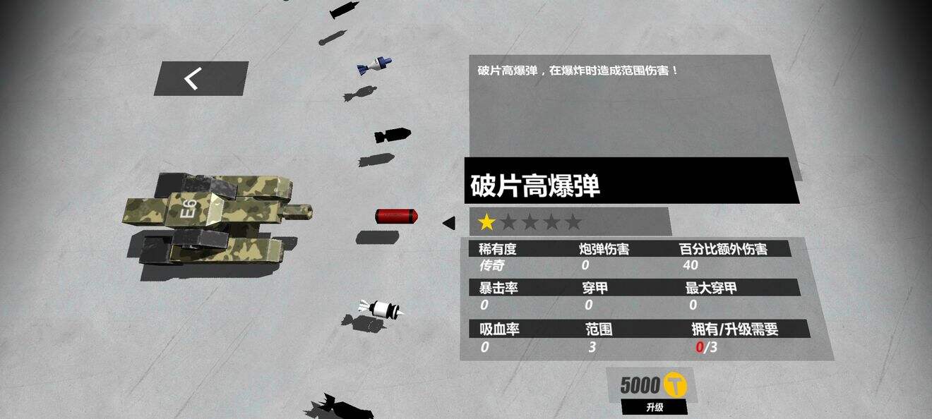 每辆坦克都有好几种炮弹选择,不过需要先从礼盒中获取,炮弹和坦克都可以升级,坦克属性点满后需要对应碎片解锁下一等级,一级坦克只会匹配到一级坦克(有极小概率匹到二级)
