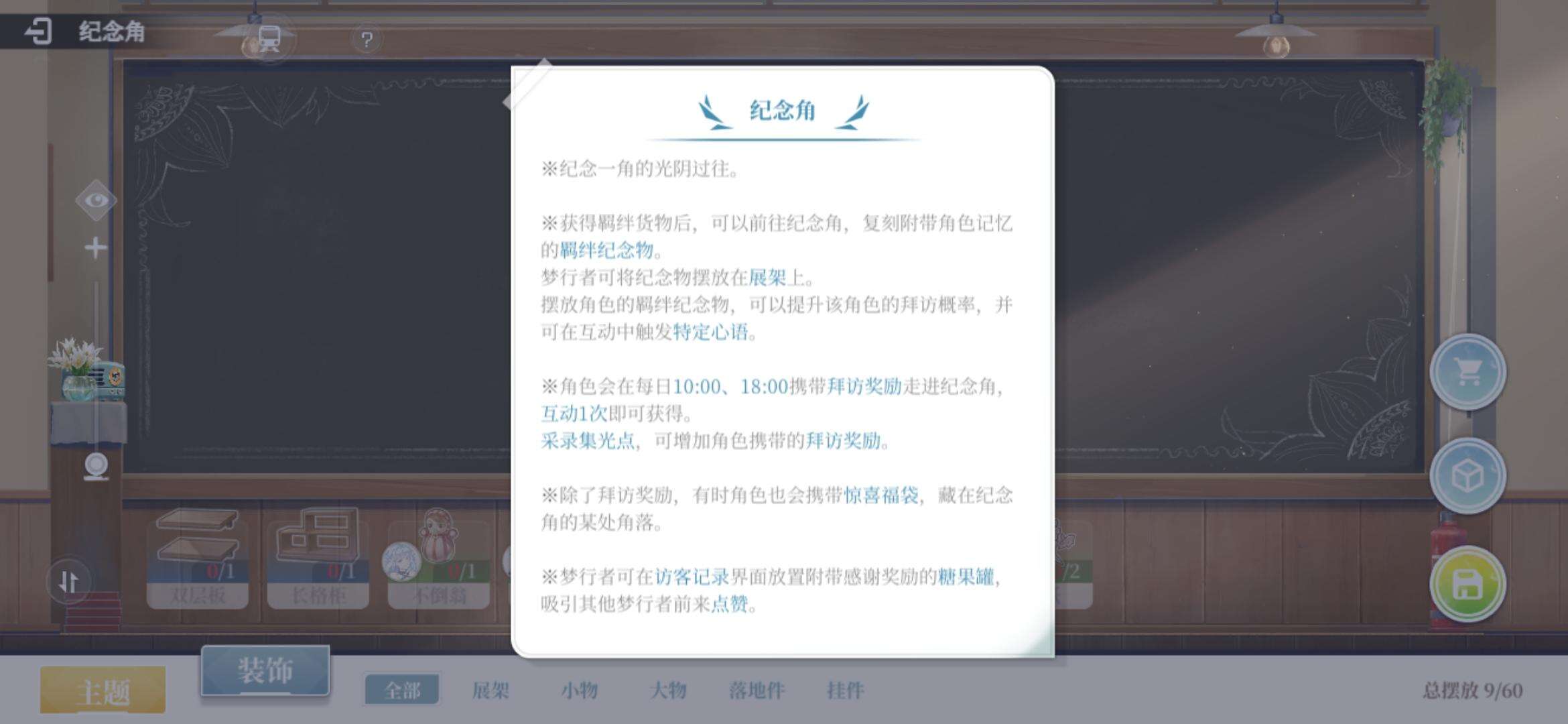 (摆放特定角色的纪念品可以提高该角色拜访的几率)