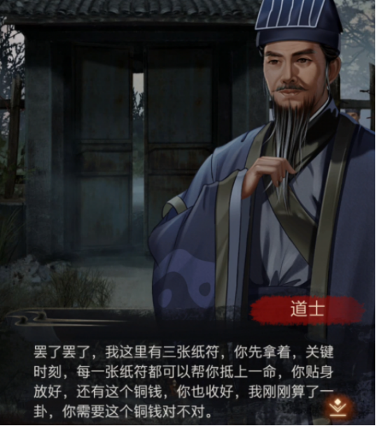 从房间出去,见到进村的道士,跟他聊聊,他会给你【三张纸符】【铜钱】