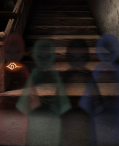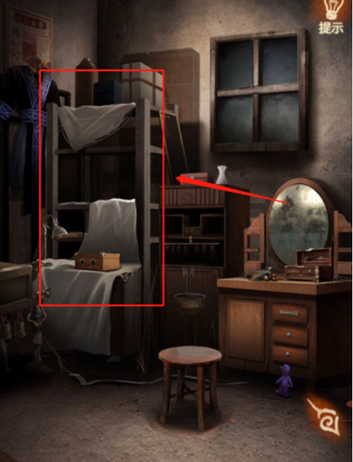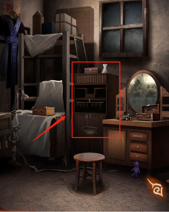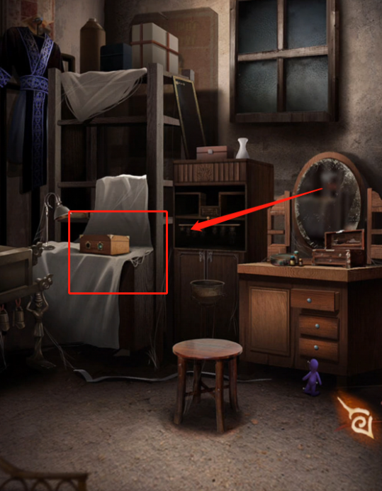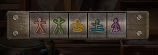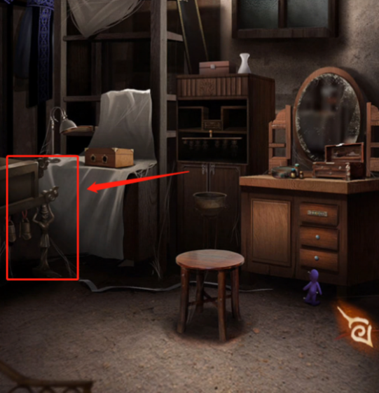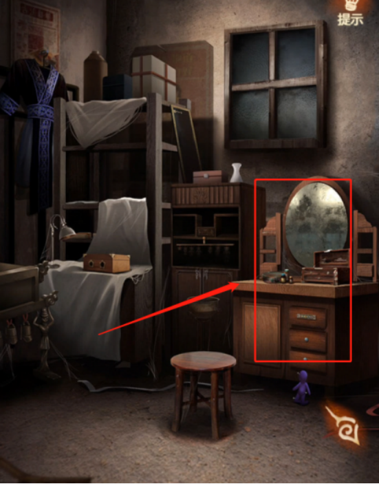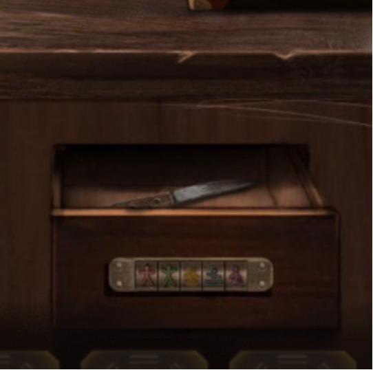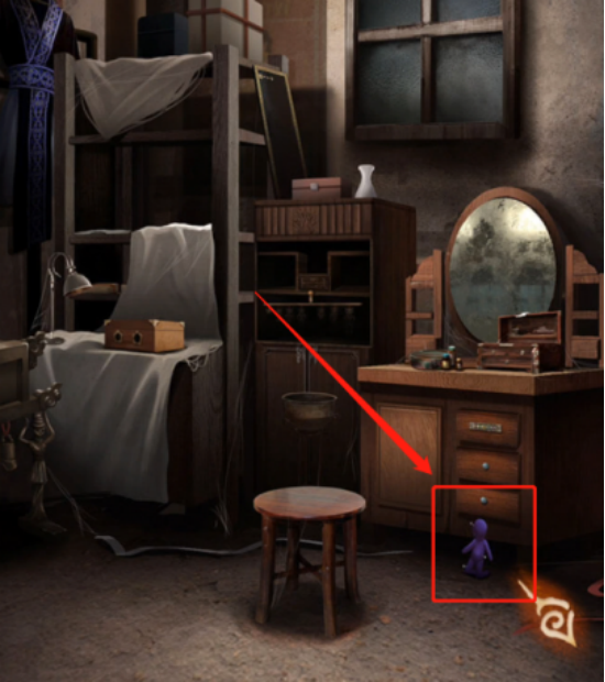 在梳妆镜下可以看到一个紫色的人偶,在中间的房间打开手机,可以看到红色和绿色的人偶,根据之前在楼梯口见到的黄色人偶和编钟上边蓝色人偶的动作,可以打开梳妆台下边的彩色锁,打开拿到【小刀】