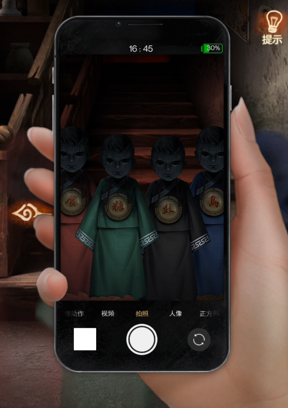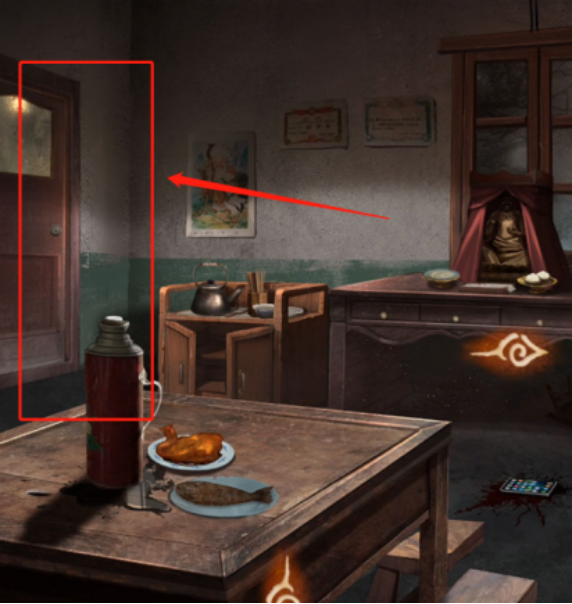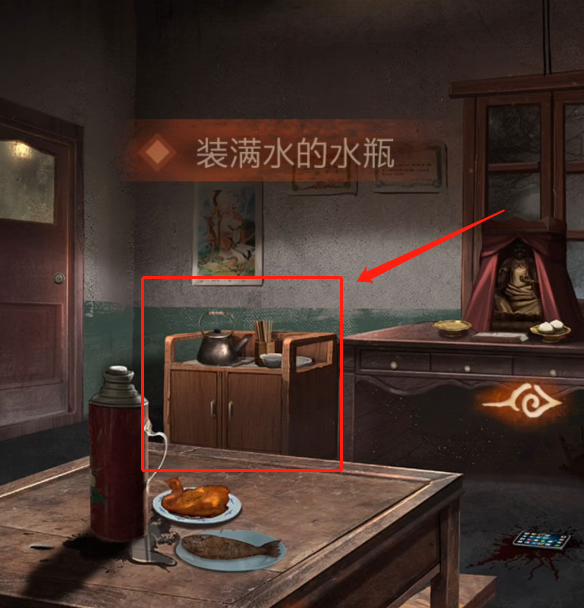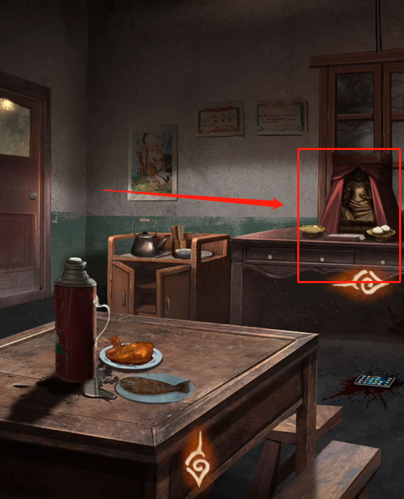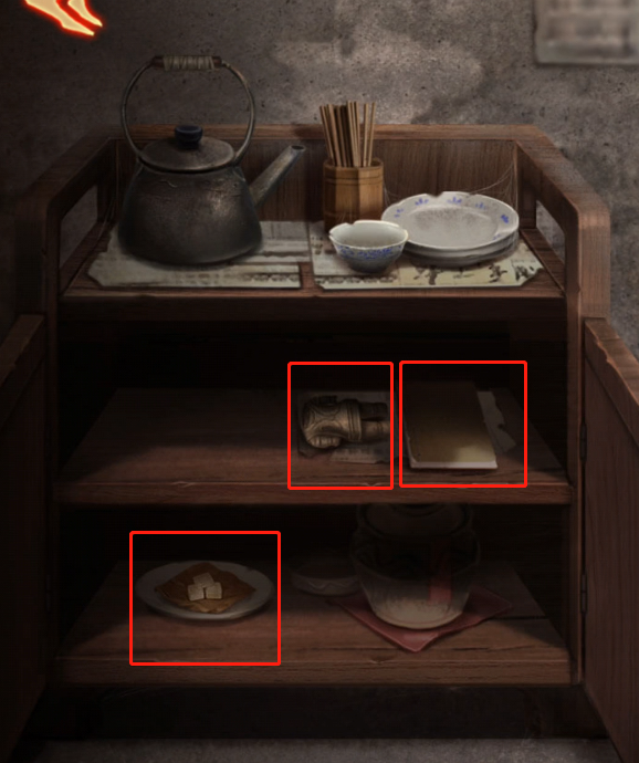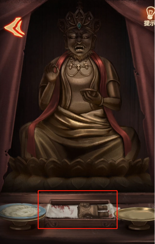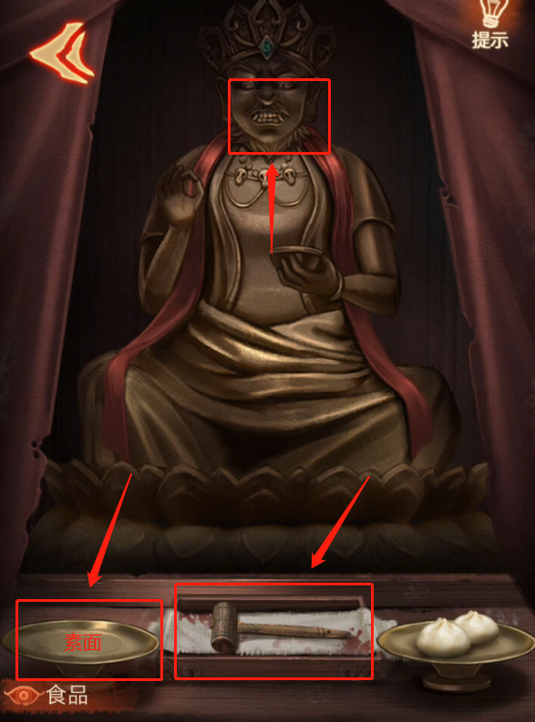 点开房间右边的佛像,点击中间方盒拿到【木锤】,在右边的盘子里拿到【包子】,将【素面】放在案台的左边盘子上,佛像嘴巴打开,可以拿到【钥匙】