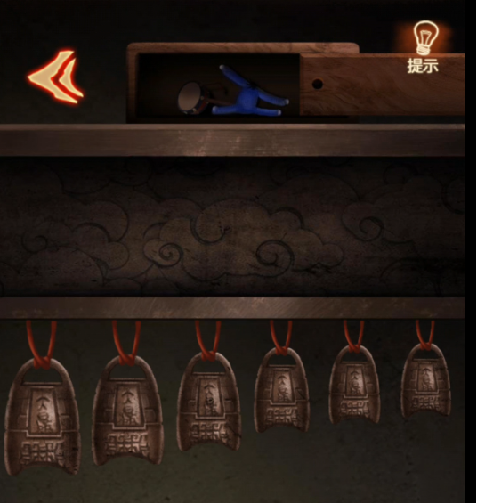 点开房间左边,有一个编钟一共六个,从左到右依次敲【324157】下,上边盒子打开,拿到【拨浪鼓】,看到【蓝色人偶】