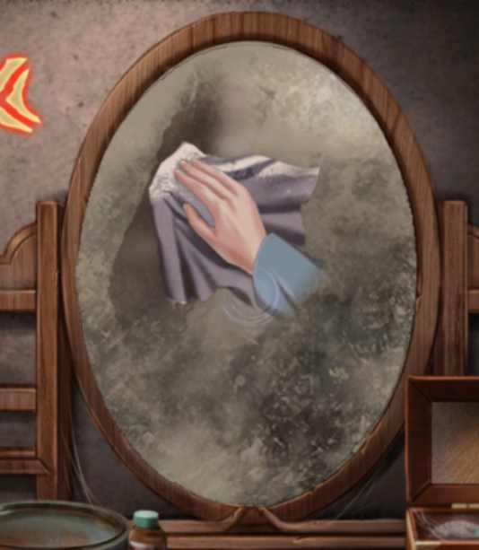 进到房间里点开右边的梳妆台,用湿衣服擦拭梳妆台镜子,镜子显示出主角的脸和一列数字,数字是镜像数字,写的是【234157】