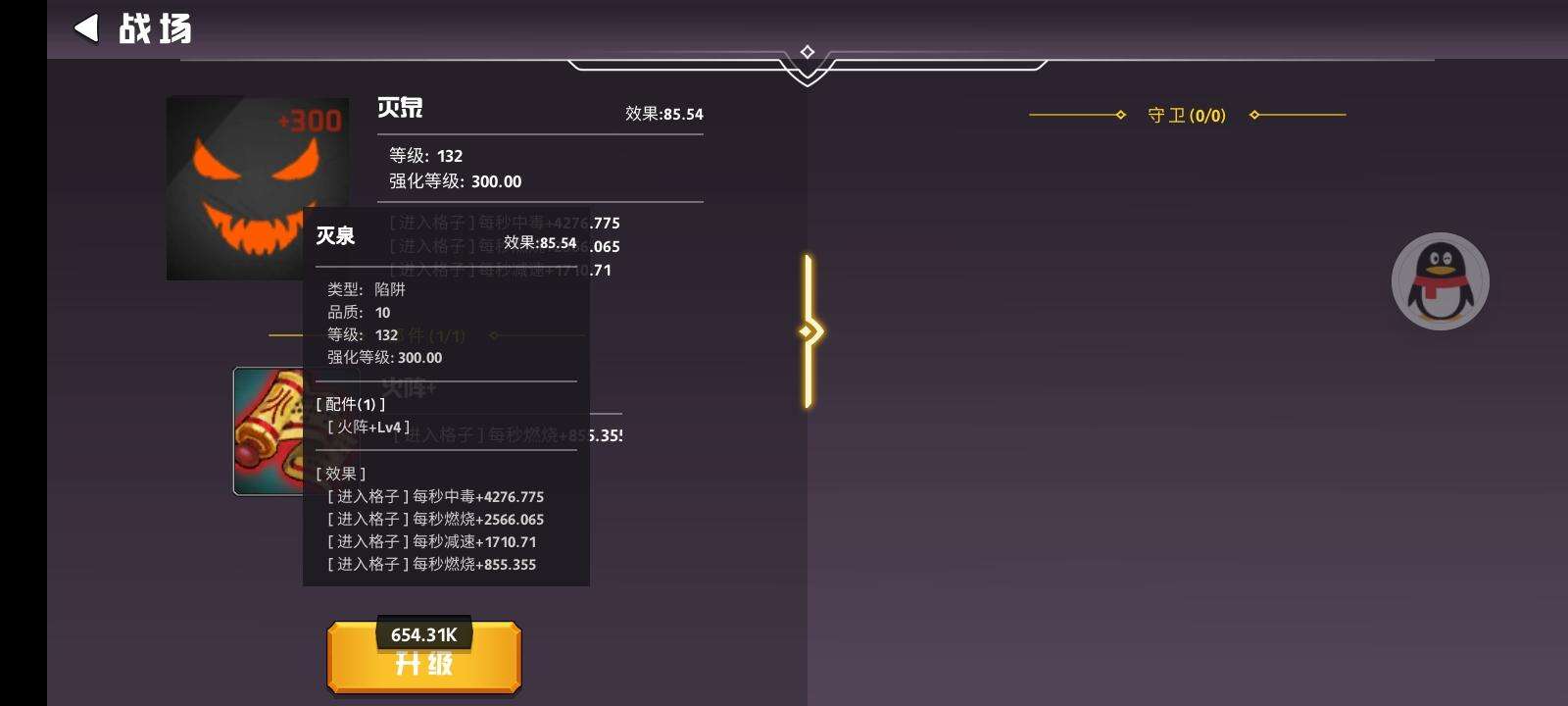 (2) 陷阱器械流(适合40关以后玩法,可以一直玩,要求较高):玩法相当与陷阱流派的升级版,需要11个灭泉和10炸弹。布阵就是,出怪口一排灭泉,后面一排炸弹,第三排灭泉,第四排炸弹,进领主房间口放灭泉,其余格子随意。给领主房间那灭泉强化高点就行,其余平均强化。这种玩法优点节约金币,因为器械伤害高只要计算好前4排的伤害直走能到4万就差不多了,余下的领主房间门口那个灭泉收割。缺点就是无法打入侵,领主房间不能放人,否则诸葛亮技能会打领主房间。