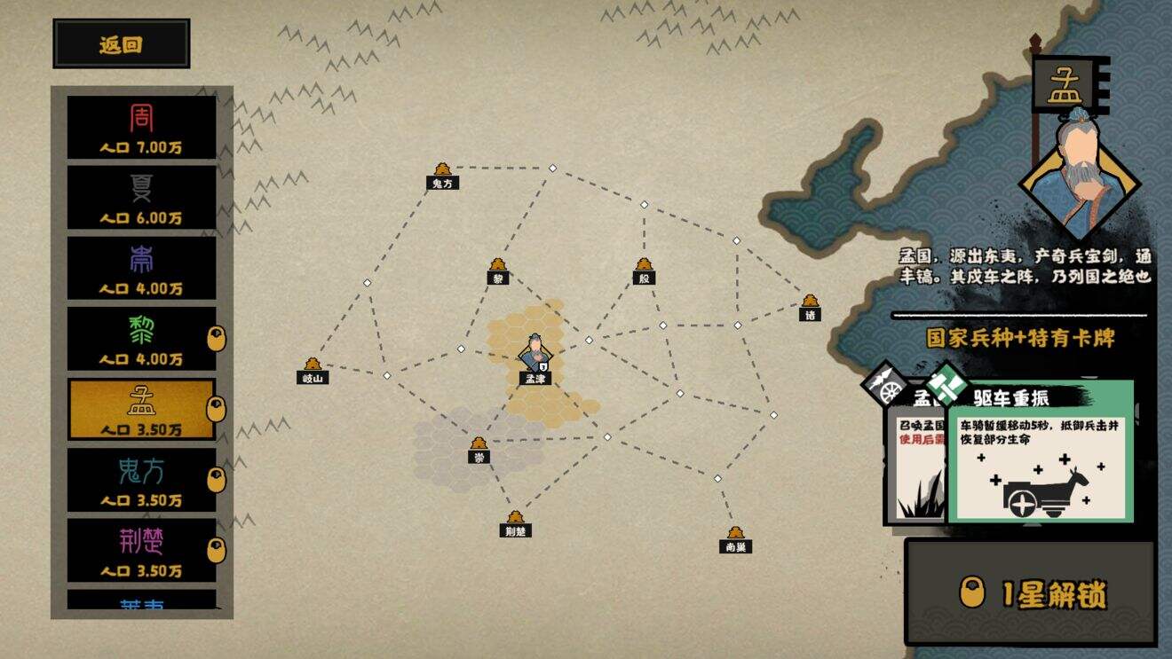 原型是邘国。历史上,邘国和崇国、黎国一道,成了周崛起之路上的三大经验值。因此游戏中,将他们设计成商朝西面的三个卫星国。而孟的位置最特殊,正好处于周、商的通路上。周一旦打下孟国,便可直接进犯牧野和朝歌!历史只有“结果”,游戏中却可以探寻“如果”。
