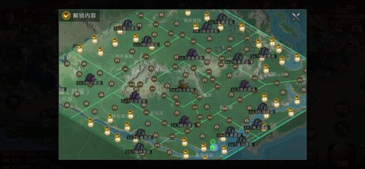 开始大家都是外面六个块的区域内,地图上的黑线是关隘。小伙伴们只能在自己的区域内活动。随着进度,进入里面三个地块,直到争夺最后一个,地图左上角有个跨服。