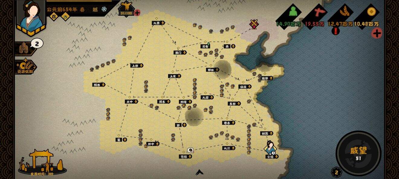 征讨国家:先打河东,河东和魏本体被分离,没有援兵很好打,然后就是雁门,邯郸(前期赵很弱不要怂直接干),打下来全部换资源;