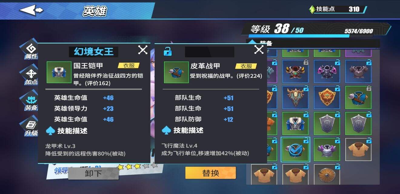 防具和鞋子根据不同关卡可以自由选择,救援关卡可选择移速或飞行技能,其他关卡可选择龙甲和吸血技能防止暴毙