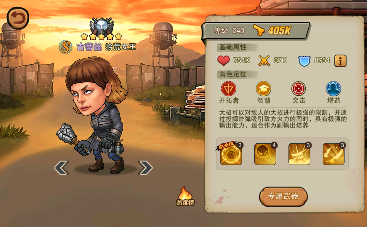 吉蒂丝的攻击属于范围性伤害,在面对一大波丧尸时,有很强的的清怪能力,可以尝试搭配莫西。莫西可以聚怪,加上吉蒂丝炸弹,可谓是一炸一大片啊,想想那场面就很爽,作为副输出吉蒂丝是非常值得去培养的。