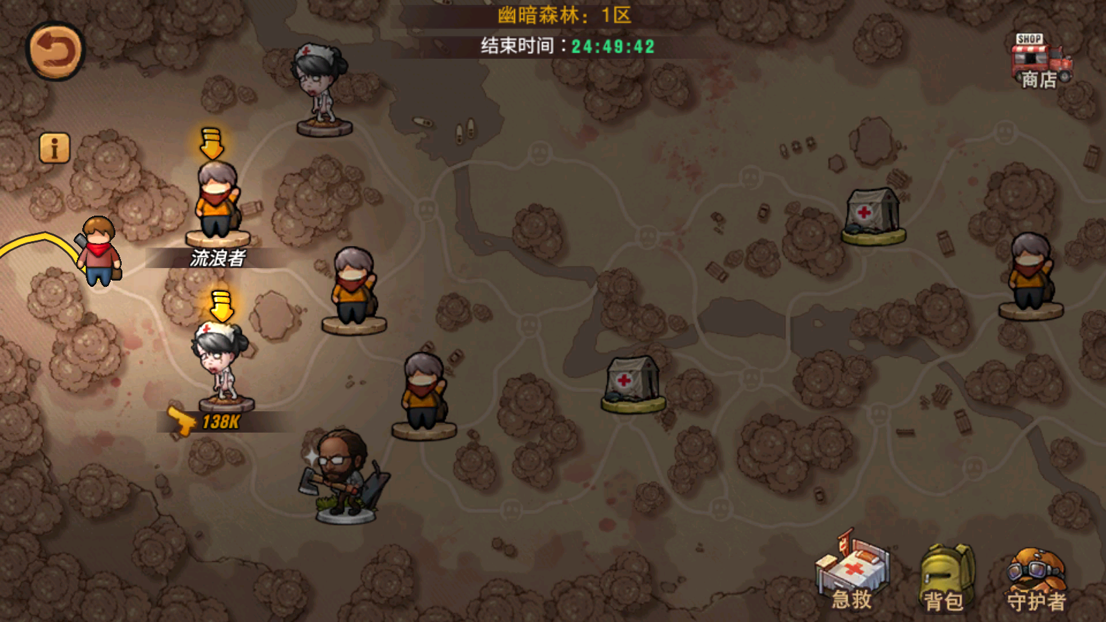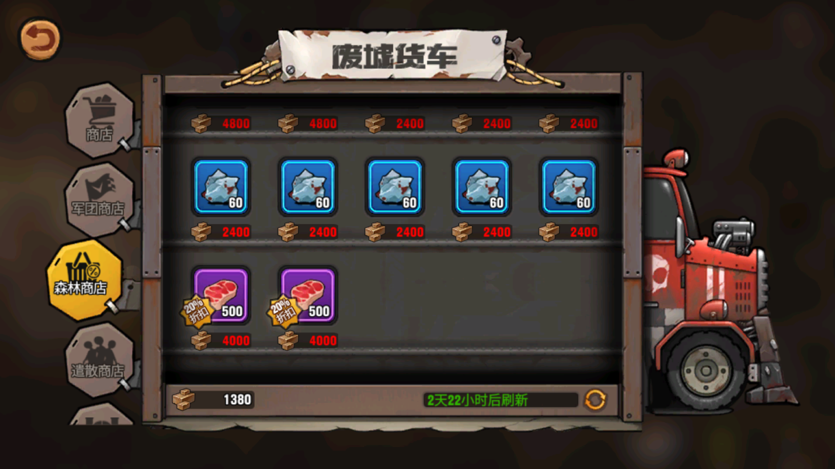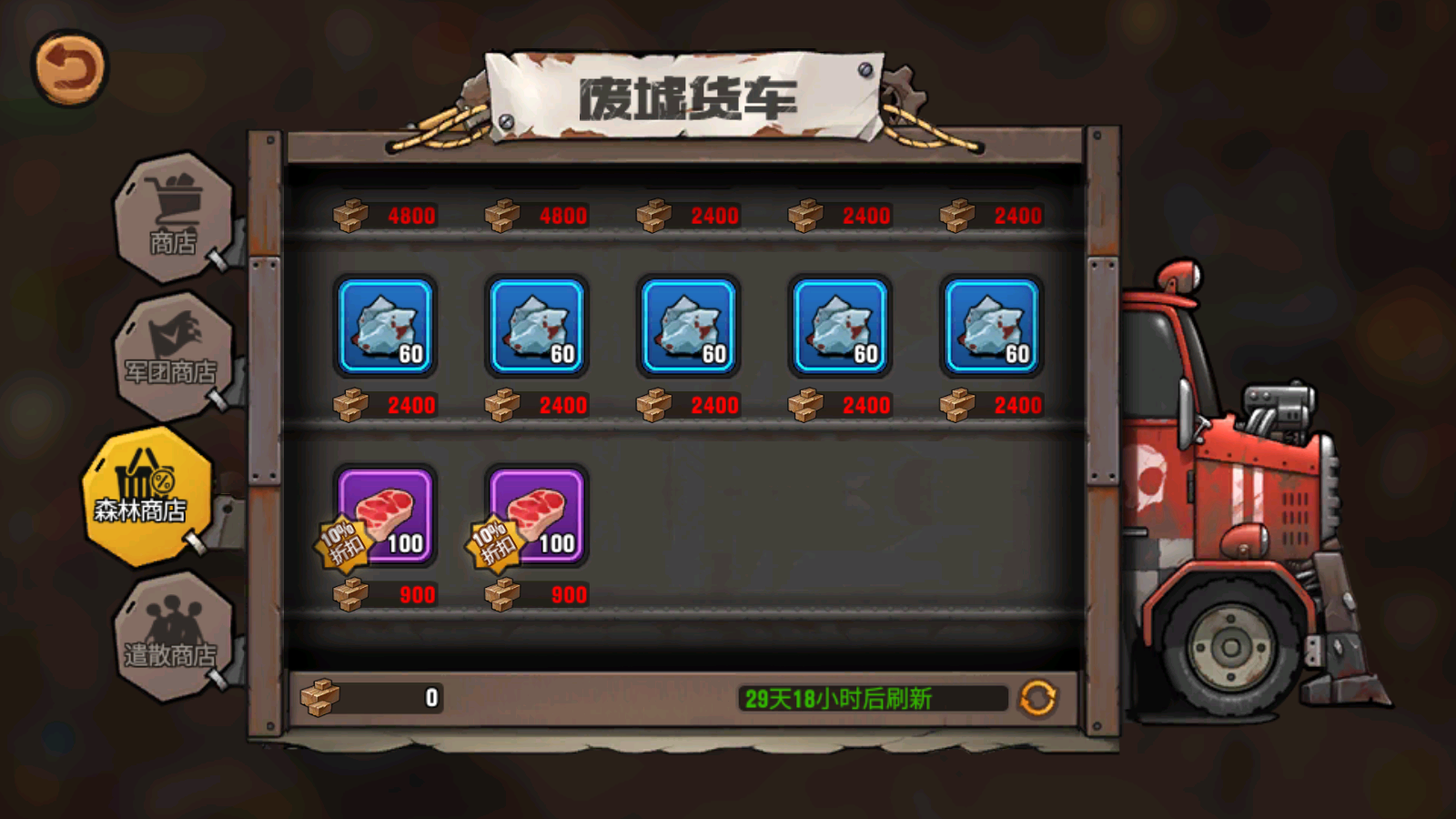 游戏中最稀缺的资源其实不是可以升级的罐头、粮食,而是肉块和重复的角色卡。前期是会缺少罐头,不过进度放慢一点也无伤大雅,但是到中期必须要升角色品阶才能突破角色的等级上限,这就显得重复卡和肉块格外重要。这两个东西在末日来袭幽暗森林的商店里最容易白嫖到,先来看一下末日来袭幽暗森林的商店: