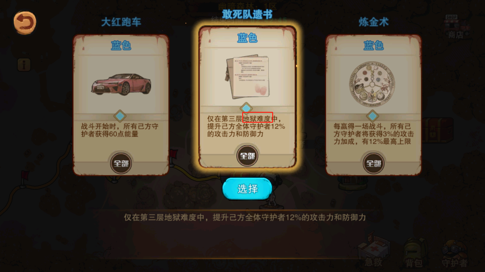 这里的buff十分重要,到达一定的等级,第三层之后的末日来袭幽暗森林是有难度选择的。你可以选择普通难度也可以选择地狱难度,这里的buff就是为了地狱难度中那个奖励丰厚但战斗力很离谱的boss叠的。