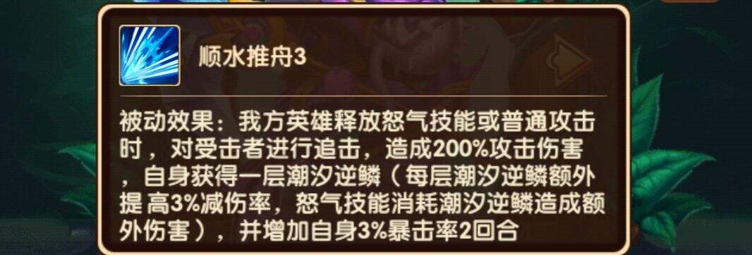 3技——我方释放普通攻击或怒气技能时,额外造成200%攻击伤害(也没有好好看过,这也是个神技了),自身获得一层逆鳞并增加3%暴击率3回合(不确定暴击率是否会叠加)