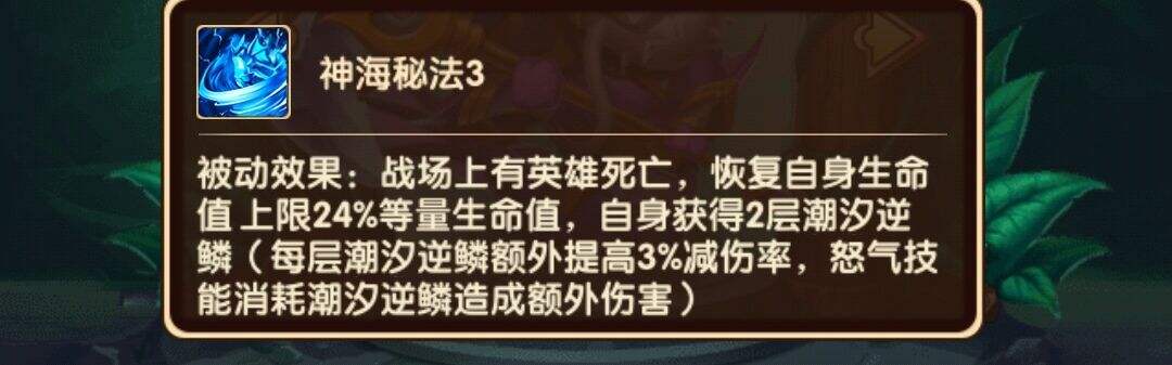怒气技能——对随机三名敌方英雄造成480%的攻击伤害并释放所有潮汐逆鳞(每层逆鳞额外提高3%的减伤率,怒气技能消耗逆鳞造成伤害),每层逆鳞对随机一名受击者造成300%伤害(以前没好好看,以为是对所有受击者同等伤害,这倒是一个鱼人的弊端,伤害无法能准确给到敌方主力输出),释放后逆鳞清空