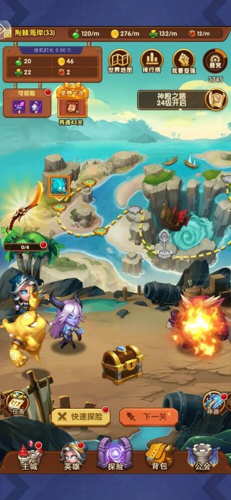 然后我们继续去探险,差不多可以打到38关,进入了我们的第二次卡关,这个时候我们使用第一次免费的快速探险到达24级,开始继续探险直到第三次卡关
