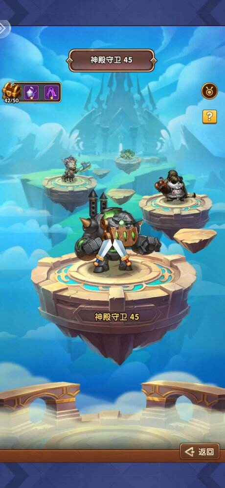 这个时候我们先不用快速探险,可以先去巨龙之路里面的神殿之路开始爬塔拿升级资源,如果卡住了,就继续给主力升级,我大概爬到了45关