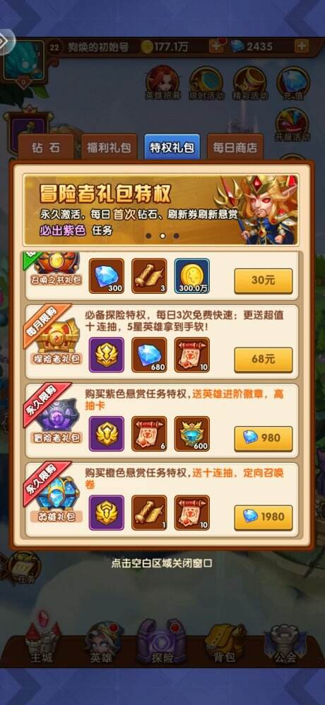 然后我们的钻够我们买第二个抽奖礼包(冒险者礼包)进行第三次的十连抽 ,一样,出的英雄先升到30级,然后用刚刚买的徽章把主力英雄升到90级,进行第二轮的爬塔