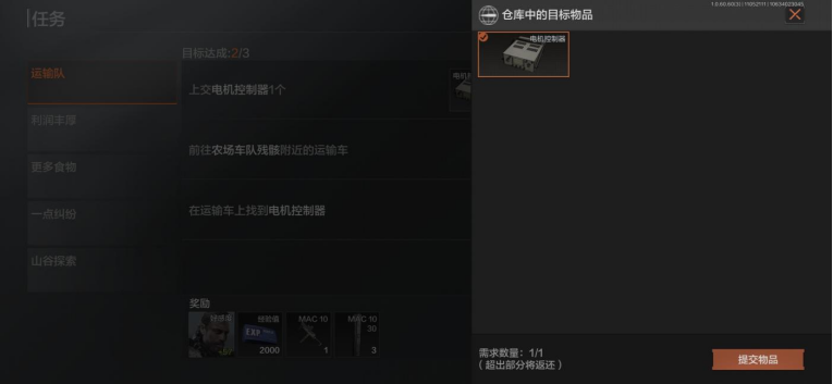 然后打开任务页面,点击提交会弹出一个窗口,选择里面的电机控制器进行提交物品,暗区突围运输队任务就完成了。