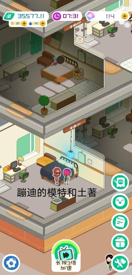 刚进游戏金币很少,不要着急升级家具,先开够单身公寓1单元1楼四间房(101—104)。