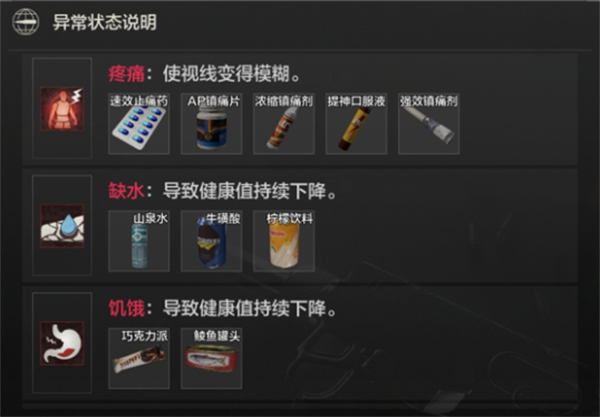 4、如果角色受伤疼痛导致行动不便的话,就可以使用镇痛剂、止疼药等来临时免疫该负面状态,然后就可以暂时恢复自身行动,等来到一个安全区域再进行治疗。