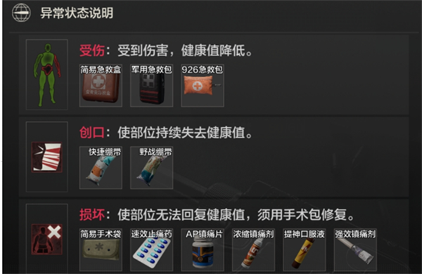 损坏状态使用:简易手术袋、速效止痛药、AP镇痛片、浓缩镇痛剂、提神口服液、强效镇痛剂;