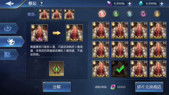 1.回退,将一个英雄回退到该星级的最低等级(100关开启)