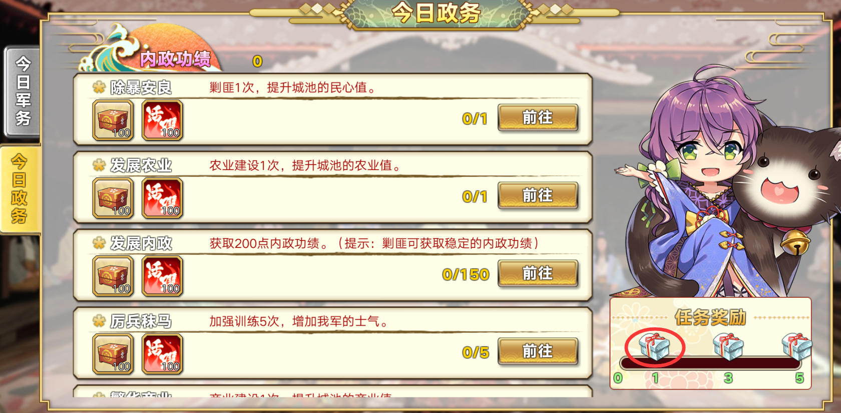 1.加入家族后先去做家族日常任务,任务分为军务和政务(最好都做完),跟着任务引导能够很轻松的完成,完成后注意把奖励领了。