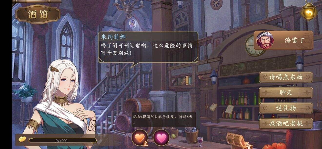其实拿到两到三重排已经差不多无敌了,装几个烟雾炮,炮船也OK。但是这不是我们的终点,我们要招打工人帮我们打工!称霸七海!娶老婆!当然娶老婆最重要!虽然语音都是棒读的,没感情,就是上学听力测试的那种,但是没关系,立绘过得去。这毕竟是一个跑商赚钱游戏,而且重排打起来修理太耗钱,打劫一个商队,结果卖的钱还不够维修。