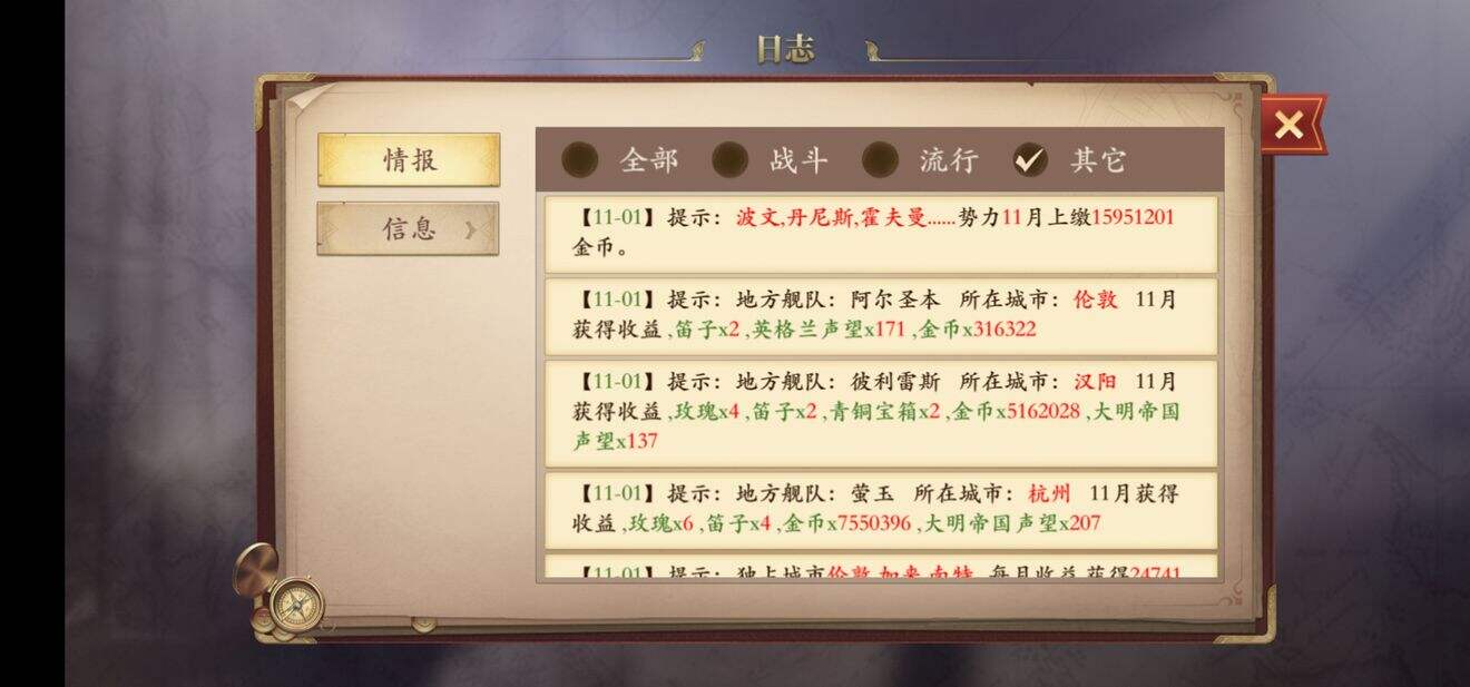 这样一来差不多主线还没怎么动,就差不多占领全部了。只要钱够了就可以买船买炮,剩下的看个人操作的其他攻略里有。核心思路来自于,来一个离岸皮包公司(占领边缘城市),鼓吹噱头吸引韭菜(刷友好度)先给甜头后套牢(威压),最后收割(收小弟钱)。小弟纳贡一个月一千多万,加上地方舰队等,一个月收入3000w左右。总共耗时两天不到。