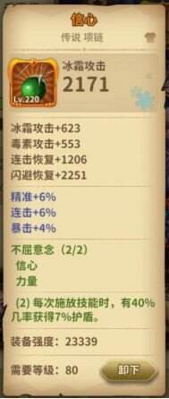 装备选择信心项链(没有的小伙伴可以用紫色品级项链转化得到)(快速施法、快速叠盾套装);织法者头盔,织法者护手,织法者衣服,(织法套配合高急速 降低技能触发间隔 增加高抗性高生存);四角空间(高四维抗性,-18格挡,但法师没有格挡作为主要属性所以不影响);武器选择黎明(增加高额冰属性伤害)、鞋子选择引力虹吸(增加攻击力)、戒指选择共鸣(与项链同理 快速叠护盾)。