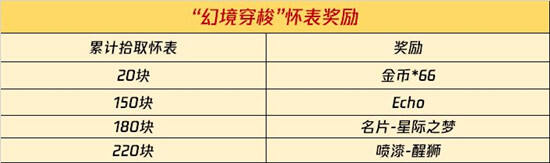 战士们只要在2021年2月22日至2021年3月7日期间内,参与“幻境穿梭”主题活动,在任意模式中淘汰1名敌人即可得到1块怀表,累计收获150块怀表,即可解锁新枪Echo哦!