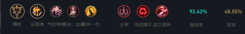 征服者仍然是最适合莎弥拉的天赋,叠加的攻击力加成可以使大招的伤害提升到最大,气定神闲来提升莎弥拉的蓝量回复效果,血统提升莎弥拉的续航能力,致命一击对低血量英雄造成更高的伤害,贪欲猎手配合血之滋味提升莎弥拉的换血能力。