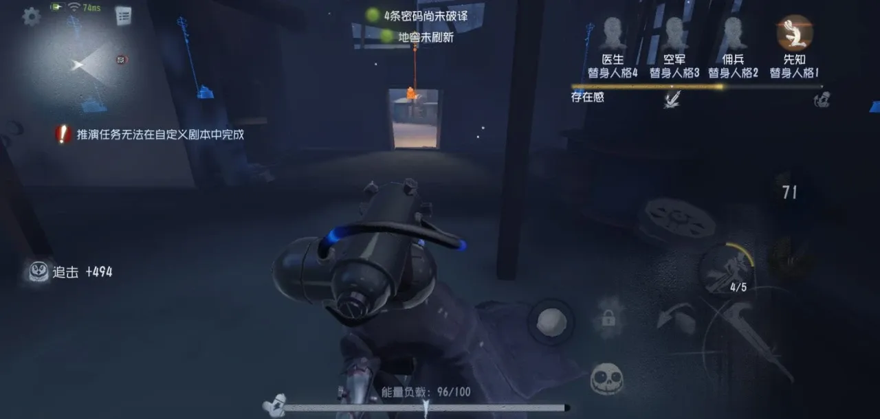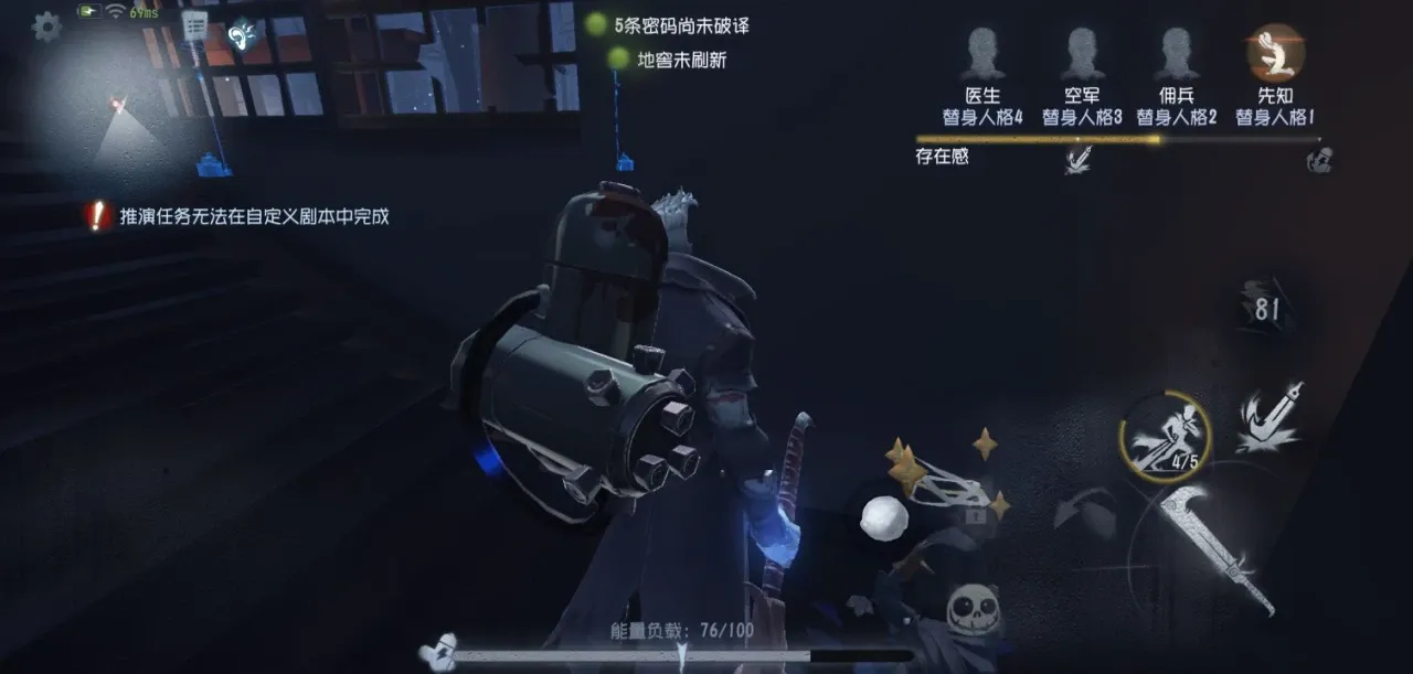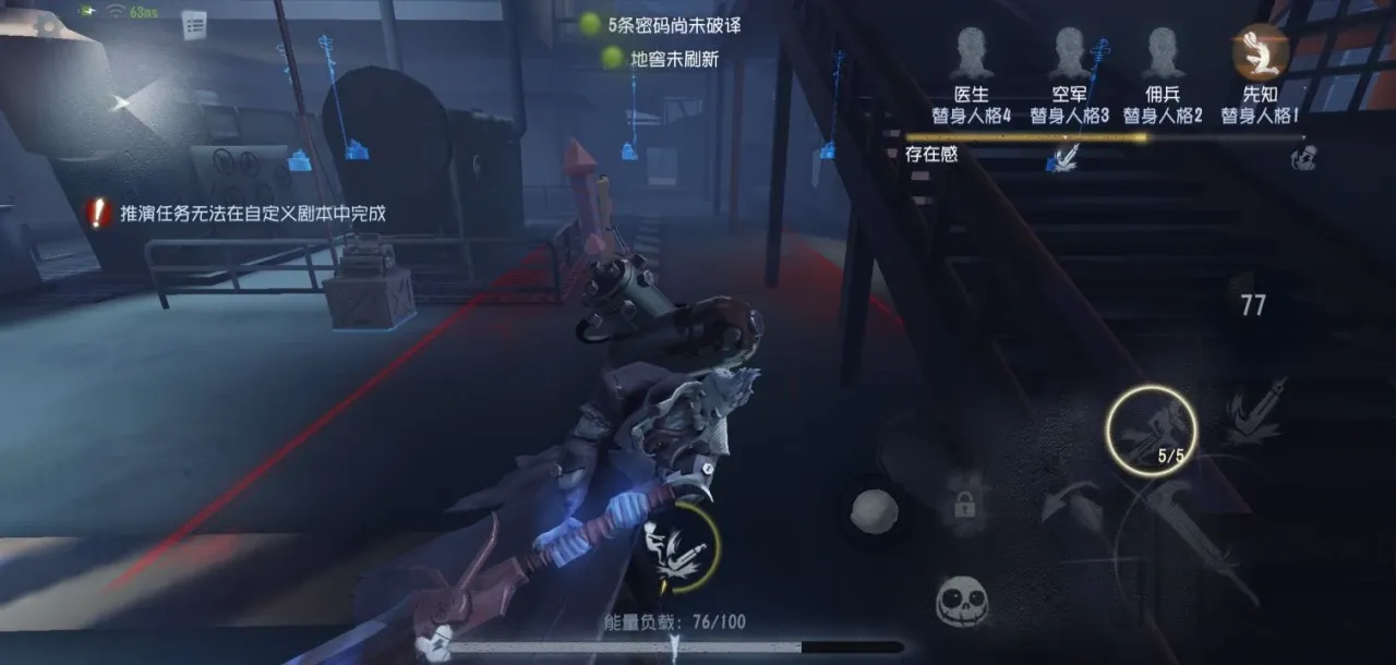 博士在开局就拥有着五段位移效果,并且会慢慢的充能,所以开局直接使用位移技能走到机子比较多的地方,出现了耳鸣标志之后就开始寻找敌人,尽量将敌人赶到空旷的区域,因为博士的位移是非常远的,如果比较近的话,就会将自己陷入较长的眩晕后摇状态,地形较窄的话,也比较限制他的发挥,博士本身移动速度以及技能动作都是比较慢的,越到空旷的地区博士的战斗力也就越强。