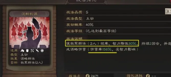 35%几率开启,要预备一回合,减少对手统帅智力150左右2回合,带来158%兵刃伤害。