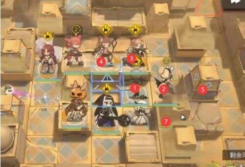 2.然后我们部署右侧阵地,远卫(银灰)→ 奶盾 → 群法/喷 → 小羊(向右)。部署完后把⑤⑥⑦的土石结构全部加固了。