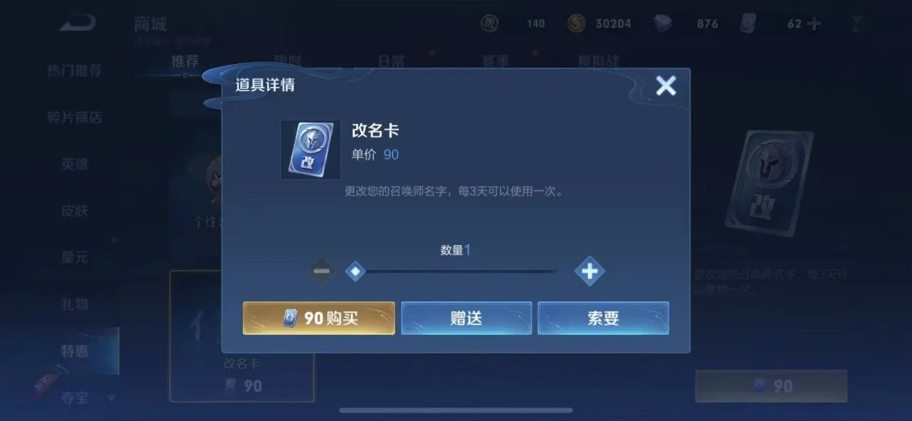最后一种方法就是通过向好友索要的方式获取,在游戏的商城内选择道具板块,点击自己想要获取的改名卡。改名卡的下面会有一个索要的按钮,点击此按钮玩家即可找到好友发送索要链接,等待好友那边支付就可以,这也是玩家免费获取改名卡的一种办法。