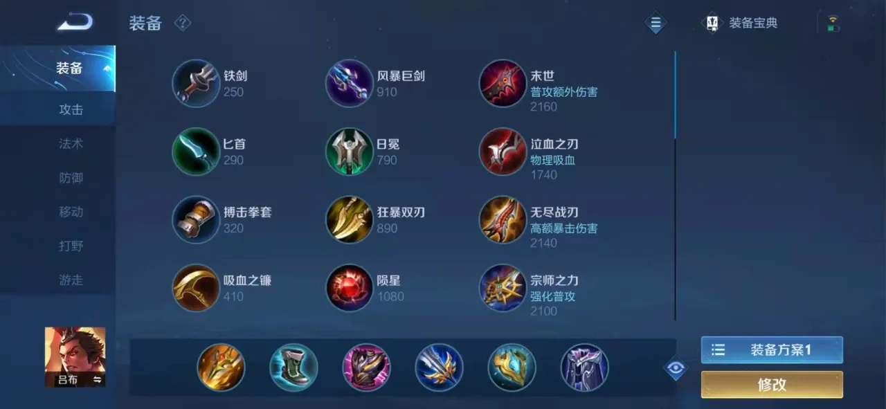 吕布第一件装备自然是黄刀,鞋子出韧性鞋。接着出个暴烈之甲,加攻击力以及防御值。之后再补一个破军,提升斩杀能力。再出一个极寒风暴,增加技能冷却缩减。最后出一个魔女斗篷即可,可以吸收大量的魔法伤害。