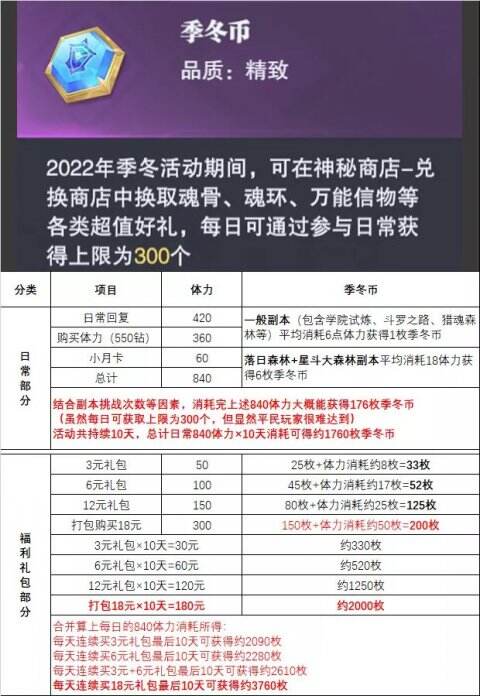 经过实测,这次的季冬币和之前的丰收之章略有不同的是在不同类型的副本下,其消耗体力所得数量比较固定,一般副本(包含学院试炼、斗罗之路、猎魂森林等)平均消耗6点体力获得1枚季冬币,落日森林+星斗大森林副本平均消耗18体力获得6枚季冬币,那么按照上图中的计算,每天如果我们买完体力共计可得360点体力,配合到正常回复的和月卡给予的大概能有840点体力,所以这840点体力能给我们带来的季冬币数量差不多为176枚左右,10天持续活动就是1760枚季冬币。