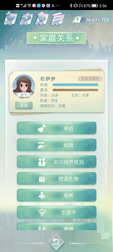 情商、道德:主要数值为出生时的随机值,游戏前期只能通过事件能带来数值变化,到达一定年龄后可以通过学校活动、活动界面的一部分内容进行增加。