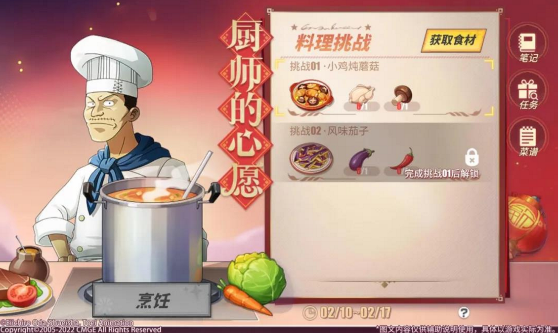 船长等级≥15级,即可前往游戏内右上角-福利-厨师的心愿界面参与活动。
