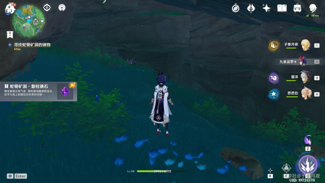 从那个洞口进来后,跳下来有个雷樱枝条可以召唤雷种子,利用雷极飞起来,镇石就在前面山壁上的凹进去的小平台上的结界内。