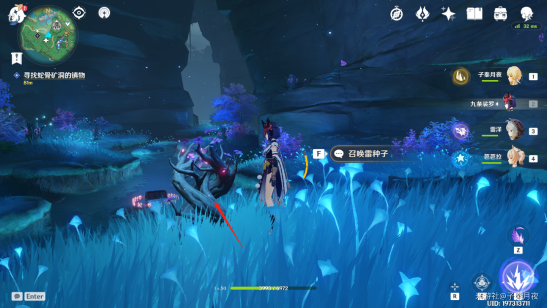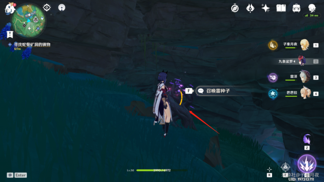飞到这个小平台上后,从旁边的雷樱结界召唤雷种子进去。